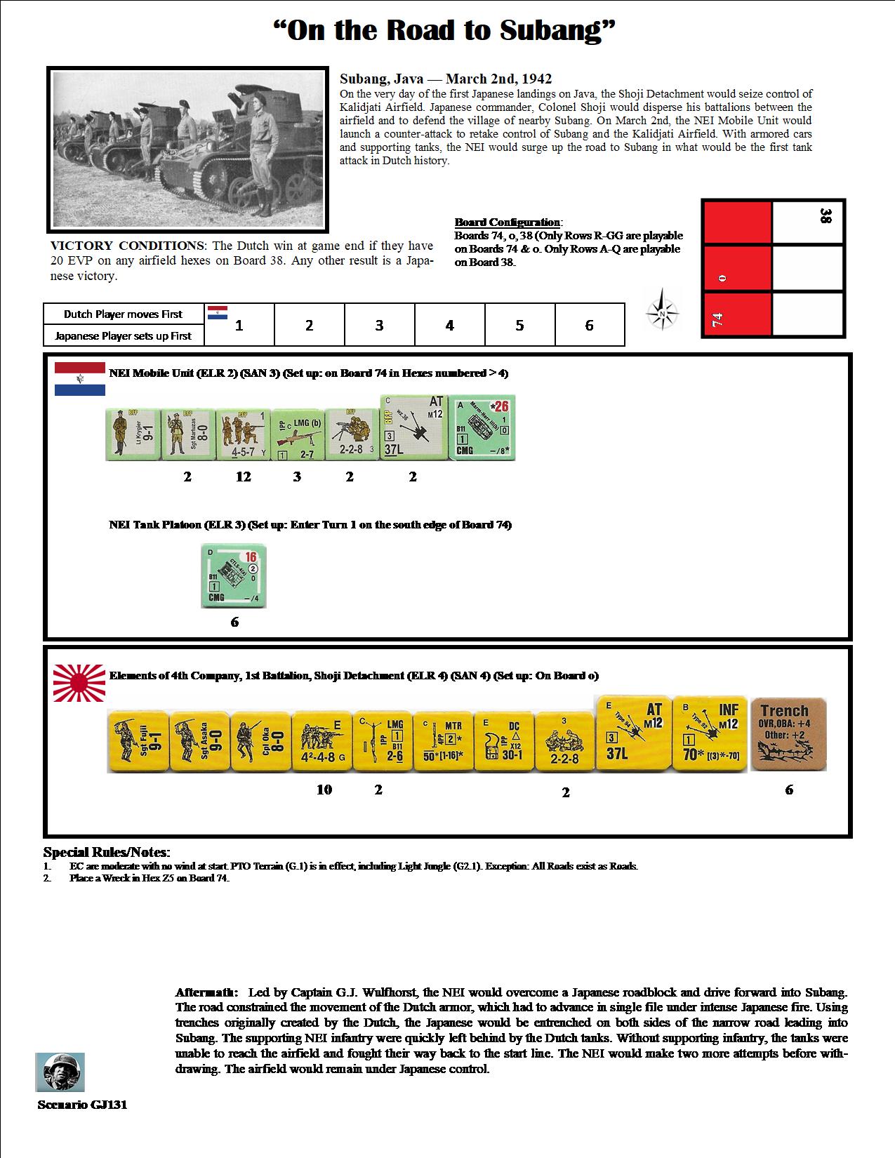 On the very day of the first Japanese landings on Java, the Shoji Detachment would seize control of Kalidjati Airfield. The Japanese Commander, Colonel Shoji would disperse his battalions between the airfield and to defend the village of nearby Subang. On March 2nd, the Netherland East Indies (NEI) Mobile Unit would launch a counter-attack to retake control of Subang and Kalidjati Airfield. With armored cars and supporting tanks, the NEI would surge up the road to Subang in what would be the first tank attack in Dutch history.Attacker: Dutch (NEI Mobile Unit and supporting Tank Platoon)