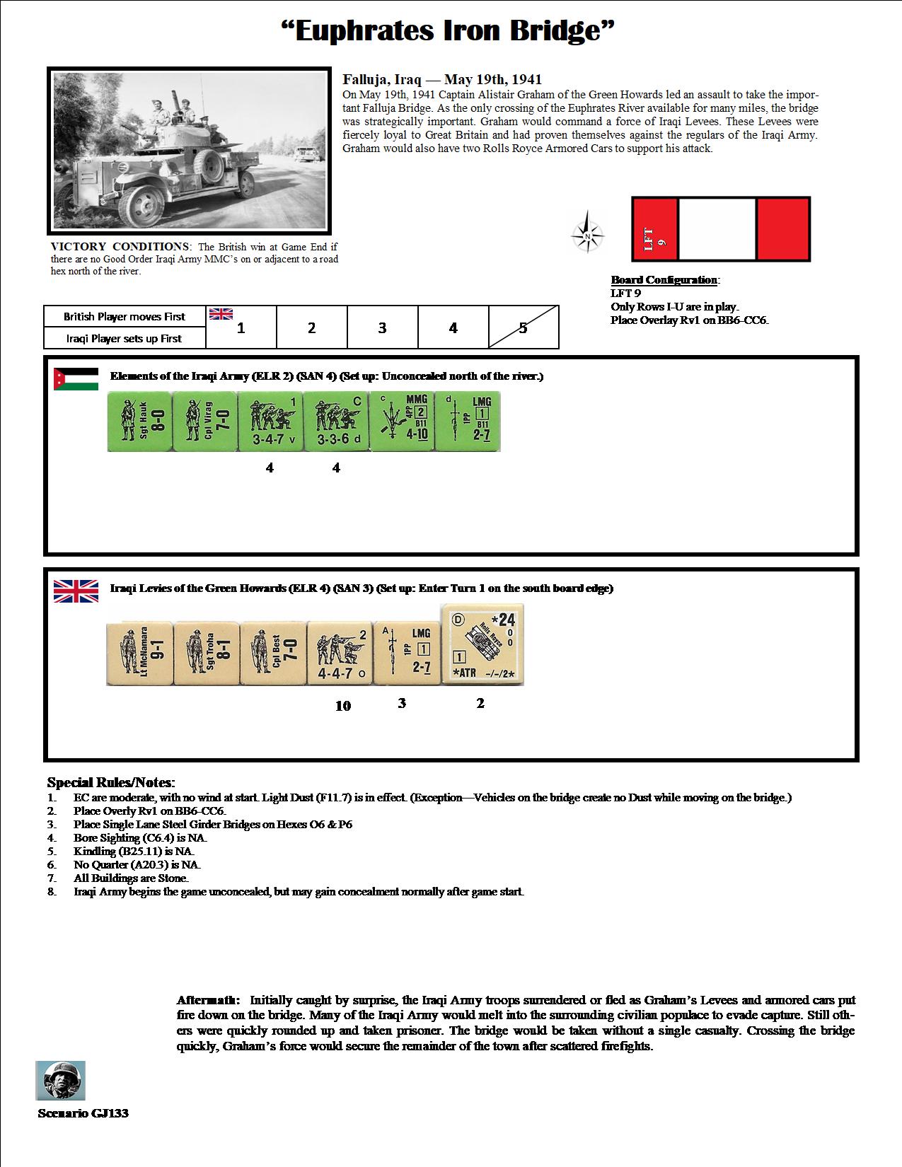 On May 19th, 1941, Captain Alistair Graham of the Green Howards led an assault to take the important Falluja Bridge. As the only crossing of the Euphrates River available for miles, the bridge was strategically important. Graham would command a force of Iraqi Levies. These Levies were fiercely loyal to Great Britain and had proven themselves against the regulars of the Iragi Army. Graham would also had two Rolls Royce armoured cars to support his attack.Attacker: British (Iraqi Levies of the Green Howards)