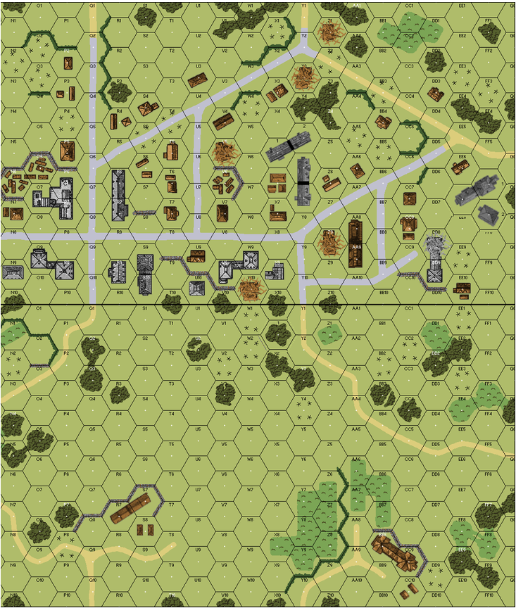 | Misc Rules: | Grain: Brush, Bldgs: Ground level only. A: AE (H1.22) and Sappers (B28.8). D: FB (B23.9) |