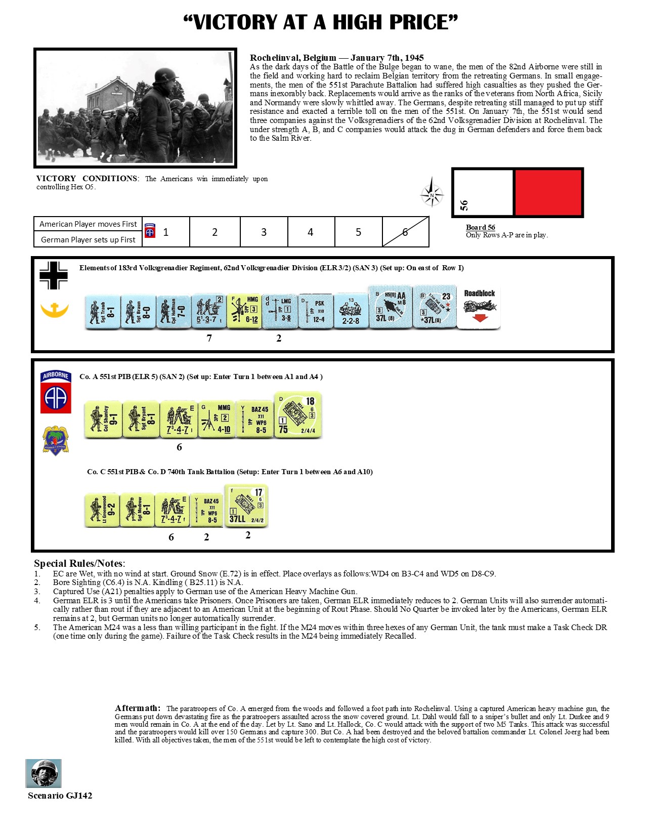 As the dark days of the Battle of the Bulge began to wane, the men of the 82nd Airborne were still in the field and working hard to reclaim Belgian territory from the retreating Germans. In small engagements, the men of the 551st Parachute Battalion had suffered high casualties as they pushed the Germans inexorably back. Replacements would arrive as the ranks of the veterans from North Africa, Sicily and Normandy were slowly whittled away. The Germans, despite retreating still managed to put up stiff resistance and exacted a terrible toll on the men of the 551st. On January 7th, the 551st would send three companies against the Volksgrenadiers of the 62nd Volksgrenadier Division at Rochelinval. The under strengthened A, B, and C Companies would attack the dug in German defenders and force them back to the Salm River.Attacker: American (Companies A and C, 551st Parachute Infantry Battalion, 82nd Airborne Division with Company D, 740th Tank Battalion)