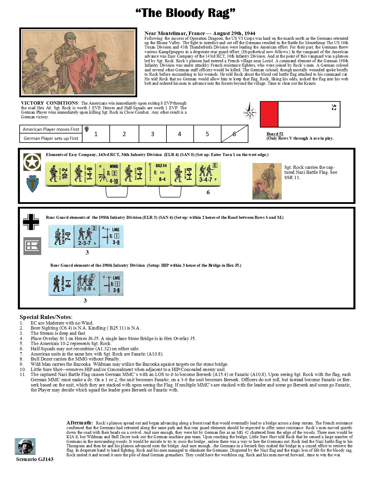 llowing the success of Operation Dragoon, the US VI Corps was hard on the march north as the Germans retreated up the Rhone Valley. The fight to interdict and cut off the Germans resulted in the Battle for Montelimar.The US 36th Texan Division and 45th Thunderbirds Division were leading the American effort. For their part, the Germans threw various Kampfgruppes in a desperate rear guard effort. (Hypothetical now follows.) In the vanguard of the American advance was Easy Company of the 143rd RCT, 36th Infantry Division. And at the point of this vanguard was a platoon led by Sgt. Rock. Rock’s platoon had entered a French village near Loriol. A command element of the German 198th Infantry Division was under attackby French resistance fighters, who were joined by Rock’s men. A German colonel and several other German staff officers would be killed. The German colonel, though mortally wounded spoke briefly to Rock before succumbing to his wounds. He told Rock about the blood red battle flag attached to his command car. He told Rock that no German would allow him to keep that flag. Rock, liking his odds, tucked the flag into his web belt and ordered his men to advance into the forests beyond the village. Time to clear out the Krauts.Attacker: American (Easy Company, 143rd RCT, 36th Infantry Division)