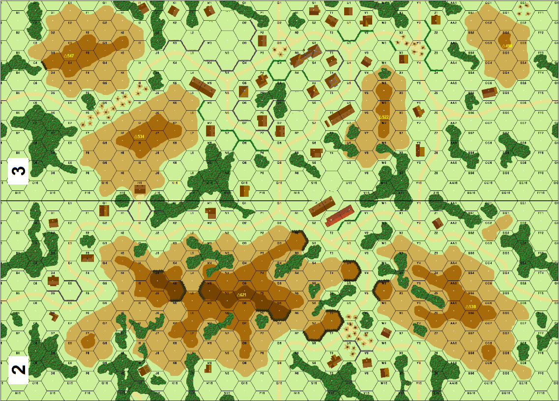 | Misc Rules: | Bldgs: Wooden, Ground Level. A: Sappers (H1.23), WP grenades. D: BT (B29.9) Lvl B on Bd 3. |