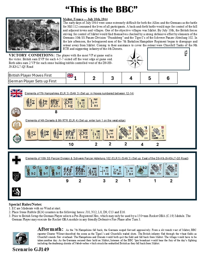 The early days of July 1944 were some extremely difficult for both the Allies and the Germans as the battle for Hill 112 consumed the lives of all participants. A back-and-forth battle would rage for control of the hill and adjacent towns and villages. One of the objective villages was Maltot. By July 10th, the British forces striving for control of Maltot would find themselves checked by a strong defensive effort by elements of the Germans 10th SS Panzer Division “Frundsberg” and the Tiger I’s of the Schwere Panzer Abteilung 102. In the late afternoon, the beleaguered men of the 7th Battalion Hampshire Regiment began to disengage and retreat away from Maltot. Coming to their assistance to cover the retreat were Churchill Tanks of the 9th RTR and supporting infantry of the 4th Dorsets.Attacker: German (SS) (10th SS Panzer Division 'Frundsberg' and Schwere Panzer Abteilung 102)